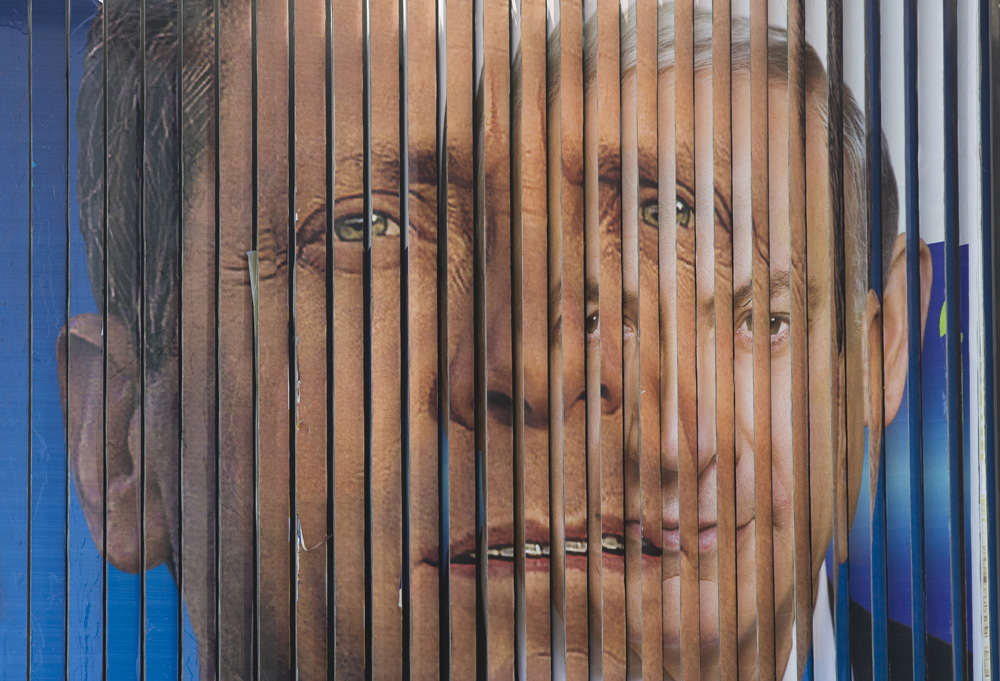 图:特拉维夫的一个竞选广告,内塔尼亚胡(右)和对手赫佐格的头像交替出现/美联社
