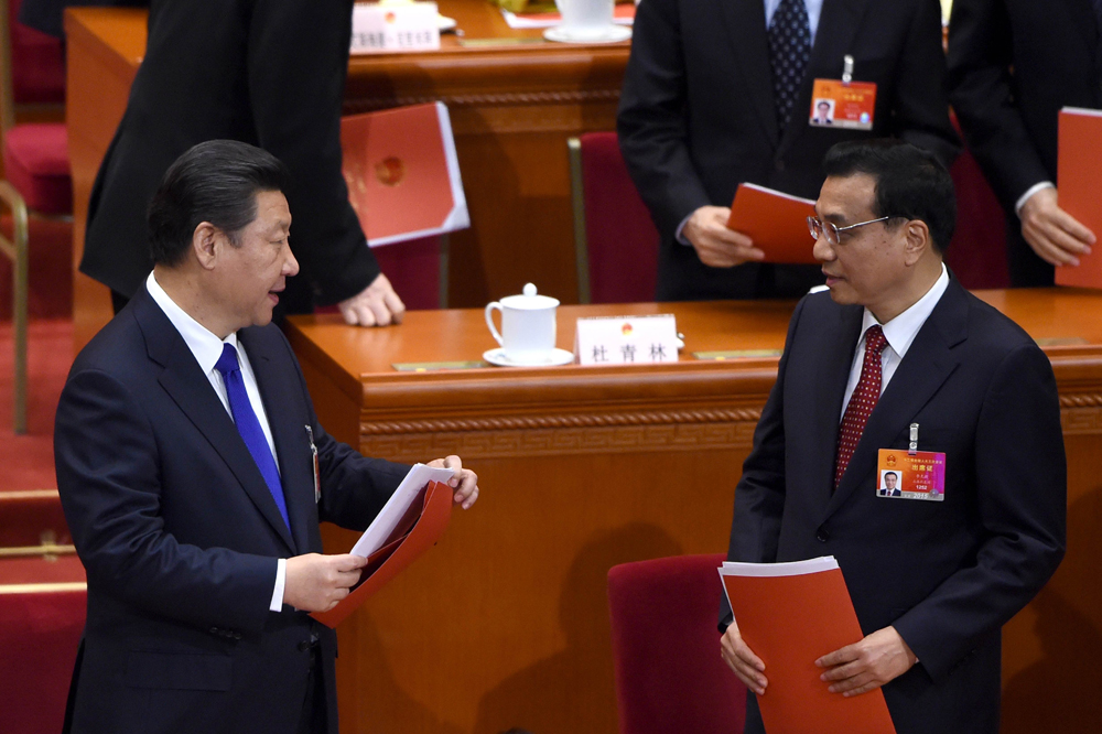 图:国家主席习近平和总理李克强15日在十二届全国人大三次会议闭幕会上交谈/法新社