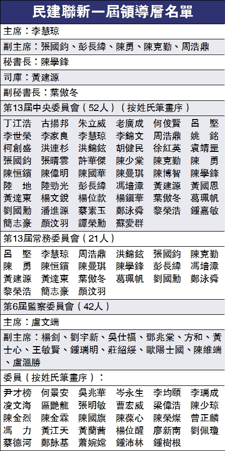 民建联新一届领导层名单