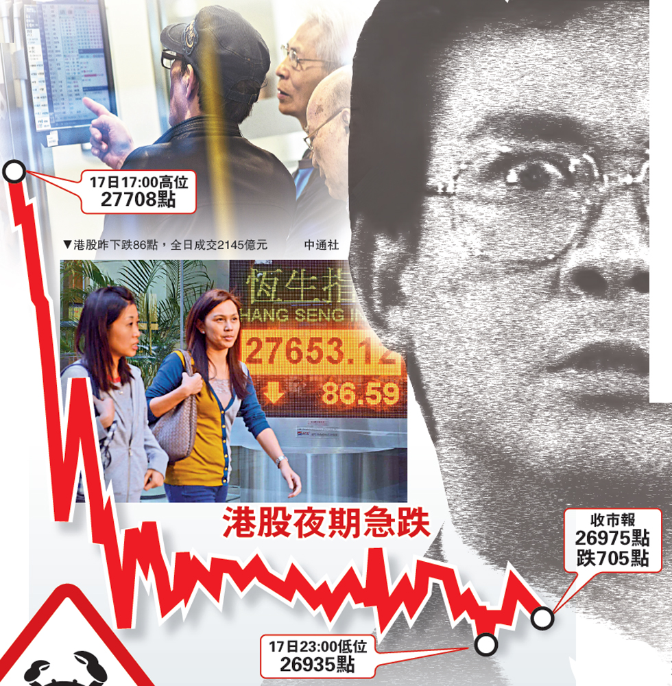 原本已位高势危的A股,遇到中证监宝剑出鞘,大户淡友昨日抢闸在新加坡狂沽A50期货,导致指数出现断崖式下泻,最多跌超过6%。受A50期货?市影响,恒指夜期早段跳水式回落,夜期一度跌722点,低见26958点。最终收市跌705点,报26975点。港股ADR比例指数方面,中段跌幅达到813点,低见26839点。港交所(00388)ADR折合港元曾见273.5元,较香港收市价低3.6%。中行、工行(01398)ADR折合港元则较香港收市价低3.1%、3%。重磅股?控(00005)更失守70元关口,跌1.5%至69.58元。