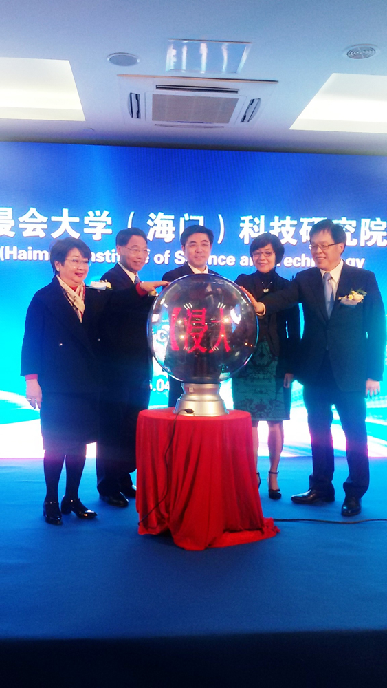 图:(左起)浸大校董陈许多琳、浸大校长陈新滋、海门市委书记姜龙、浸大校董会暨谘议会副主席陈黄穗、浸大海门科技研究院院长黄伟国共同为浸会大学(海门)科技研究院揭幕/本报摄