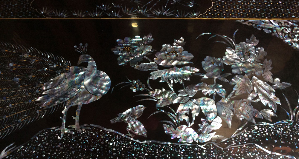 他解释道,“点”指的是技法,“螺”指的是材料,点螺选用自然色彩的夜光螺、珍珠贝等高档材料,将薄如蝉翼、小如针尖、细若秋毫的螺片,用特製的工具一点一丝地点填在平整光滑的漆坯上,经过精緻的髹漆工艺,使点螺漆器具有图案精緻、色彩绮丽、随光变幻、明亮如镜的艺术风格。