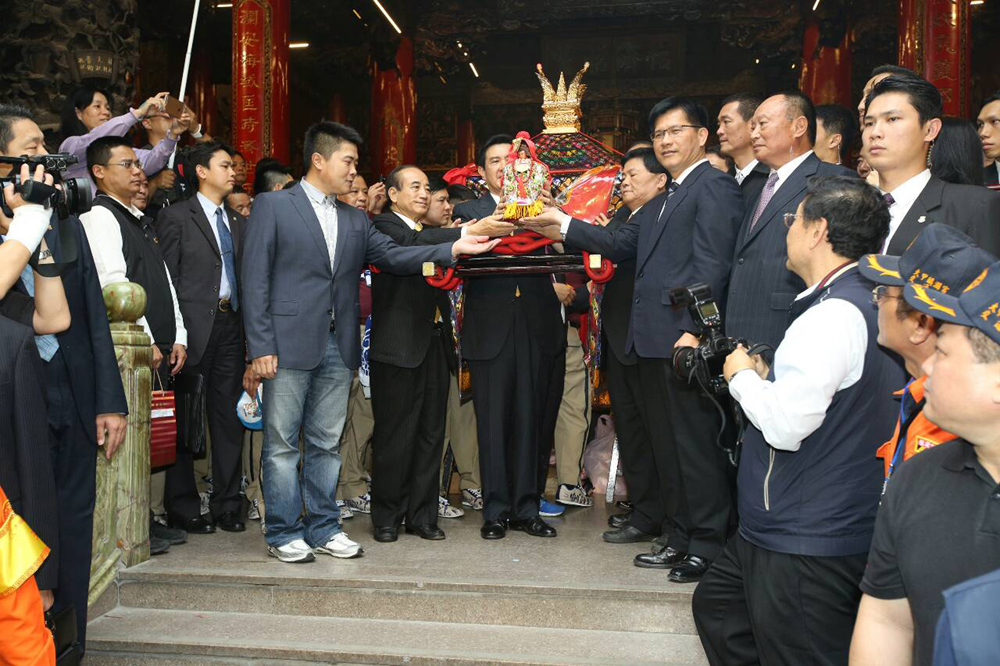 被列世界三大宗教庆典的台中大甲镇澜宫妈祖遶境,将在4月17日晚上11时起驾,展开为期9天8夜的遶境行程,沿途经过100多座庙宇,全程长达330多公里,预计26日回銮安座。17日下午5时举行上轿仪式,马英九(前排左三)、“立法院长”王金平(左二)、台中市长林佳龙(左五)等出席。 (中央社)