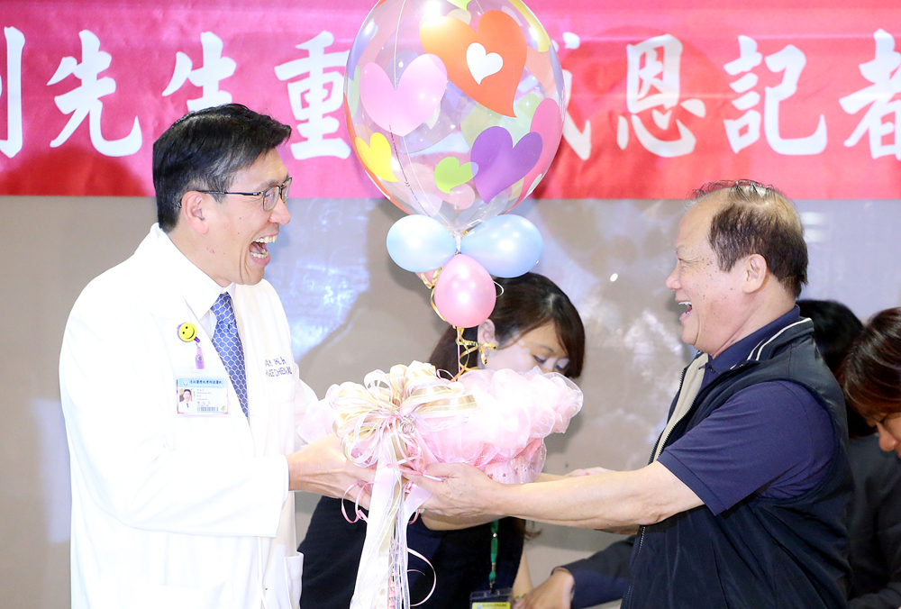 图:復兴空难幸存者之一的72岁医师刘兆辉(右)17日在台北医大附设医院出席重生感恩庆祝会,院长陈瑞杰(左)送上祝福/中央社