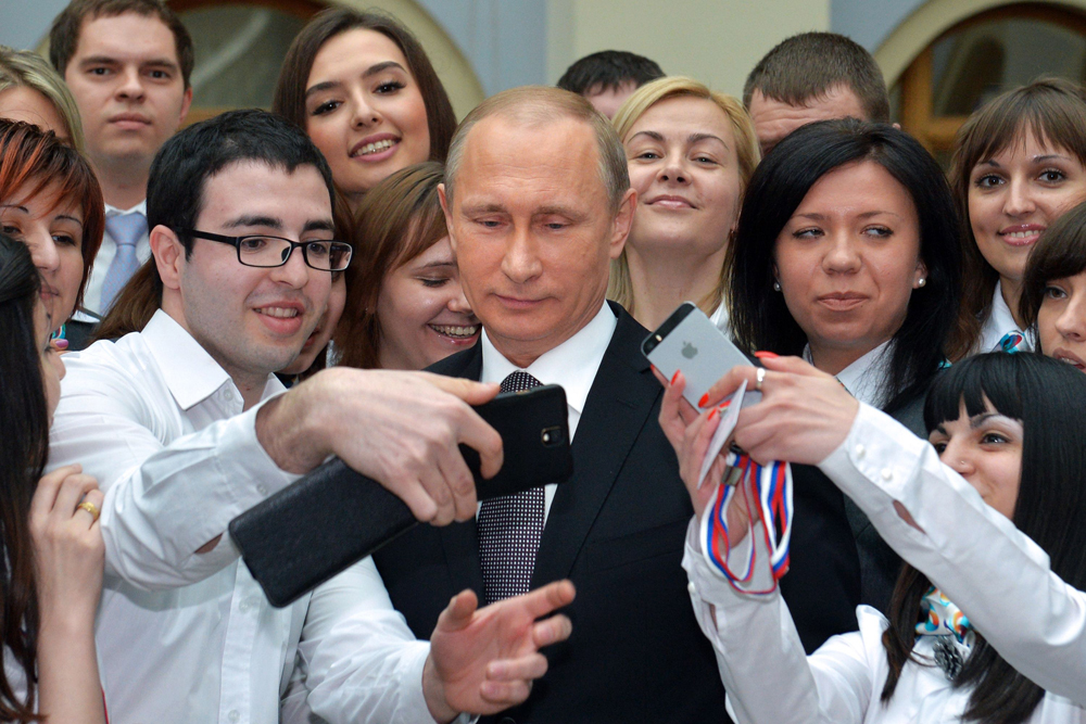 图:普京16日完成年度电视对答后和民众合影/法新社