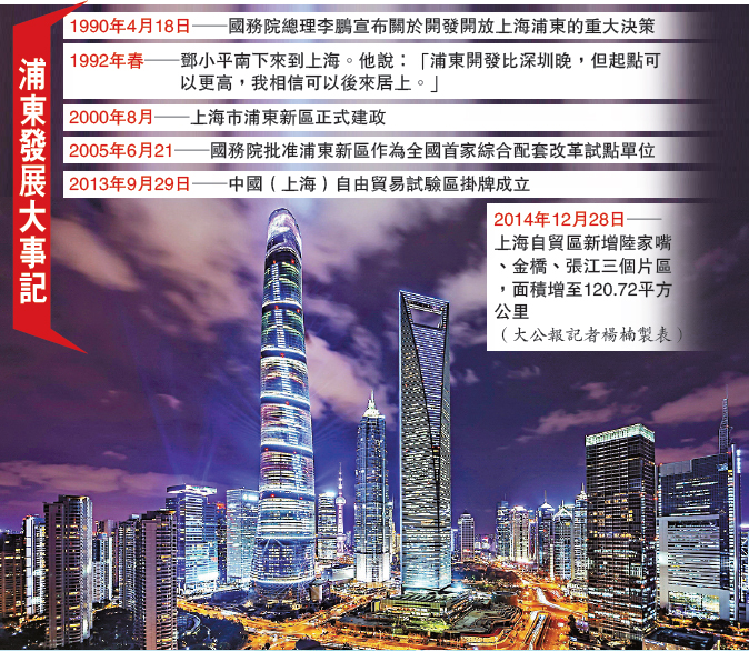 大公报记者从浦东新区政府了解到,从1990年到2014年,浦东经济总量从60亿元增长到7110亿元(人民币,下同),增长逾117倍;财政总收入从10亿元增长到2900亿元,增长了289倍;地方财政收入从5亿元增长到685亿元,增长了136倍。“世界500强”企业在浦东落户达308家。