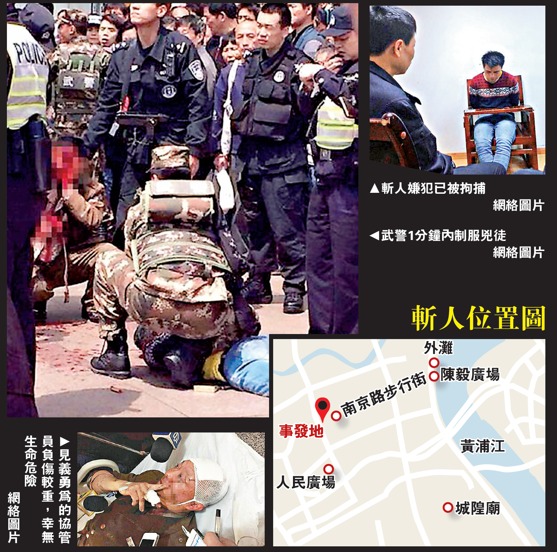 4月17日中午,一男子在上海人民广场附近,比邻上海南京路步行街的西藏中路九江路口闹市街头持刀挥砍路人,导致多人受伤。公安部门接警后迅速调集警力,在事发1分钟后将男子控制。目前伤者已被送医救治,均无生命危险。经初步调查,行兇者系外来务工人员,有精神病史,事件中的伤者正在医院治疗,均无生命危险。【大公报记者夏微上海十七日电】