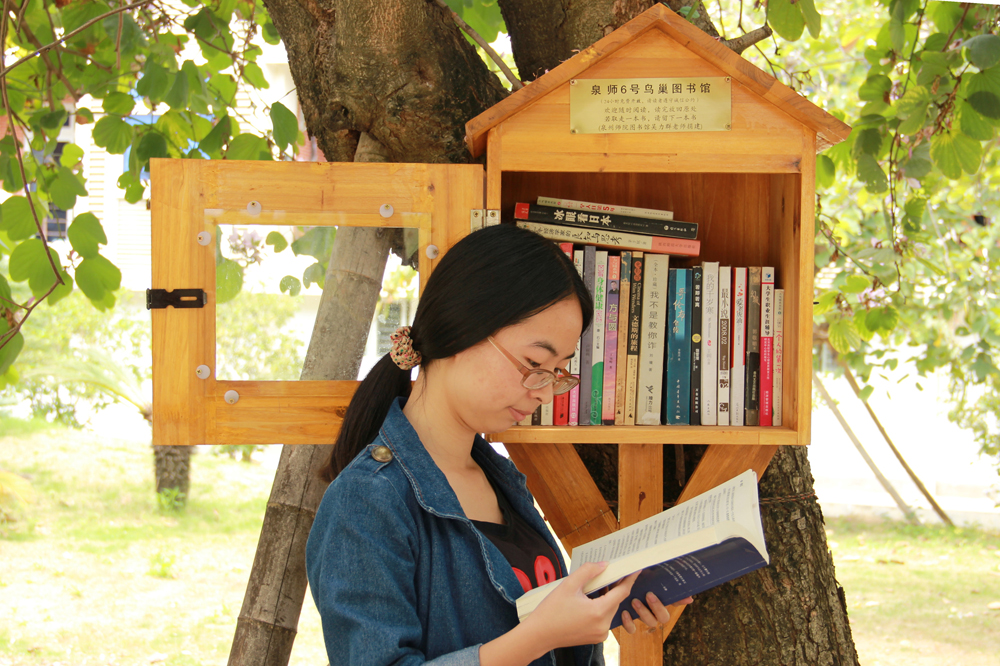 23日,世界读书日当天,福建省泉州师范学院“鸟巢图书馆”正式开馆,校园里共设置了6个这样的鸟巢图书馆。每一个“鸟巢”是一个边长大概50厘米的正方体,用木架子支撑?,有1米多高,里面整齐摆放?大概20本图书。通过“取走一本书,放入一本书”的原则,让图书在学校里自由“漂流”。