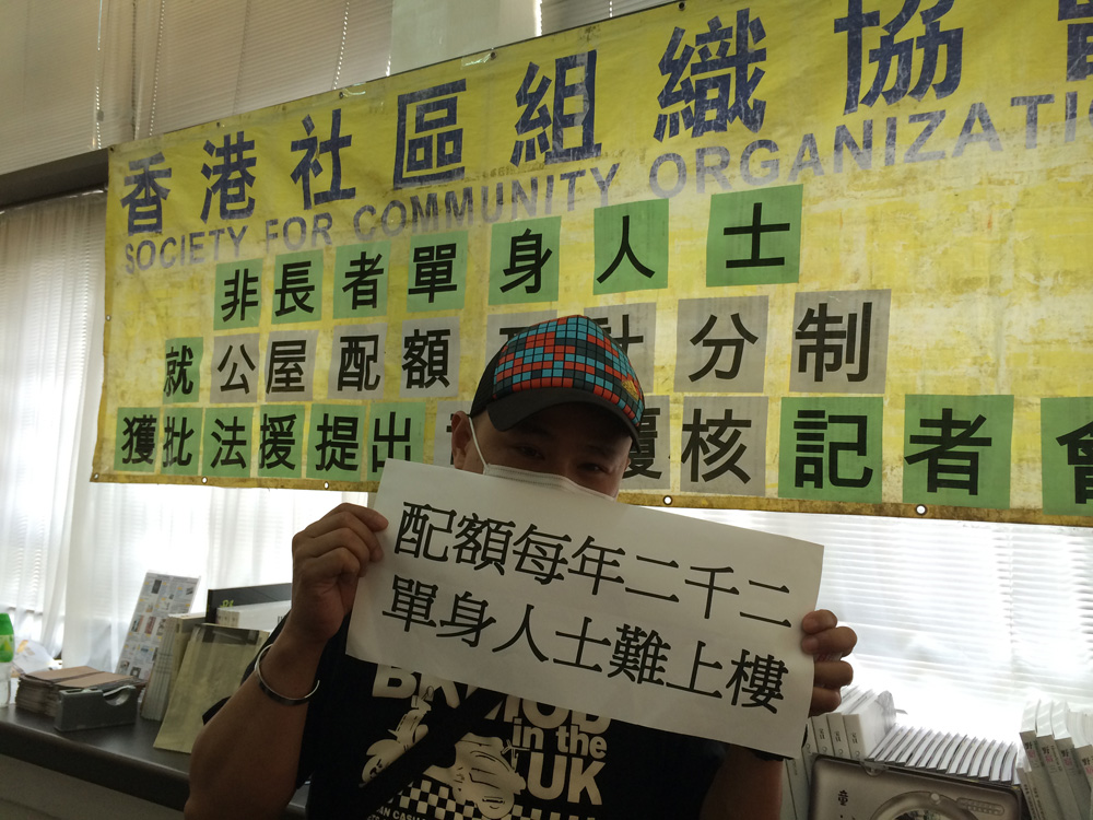 截至今年三月底,公屋轮候册申请达27.8万宗,当中逾半是非长者单身申请,超过14万宗。社区组织协会社区组织干事戚居伟指,一般家庭申请公屋按先到先得原则,平均三年可上楼,但14万非长者单身申请者则採用计分制,每年只获编配2200个单位,做法极不公平,质疑政策违反了香港居民在法律面前一律平等和可依法享受社会福利的权利等三条基本法条文,故以此为理据提出覆核,要求房署重新检讨计分制,一至两个月内会正式向法院提出司法覆核。