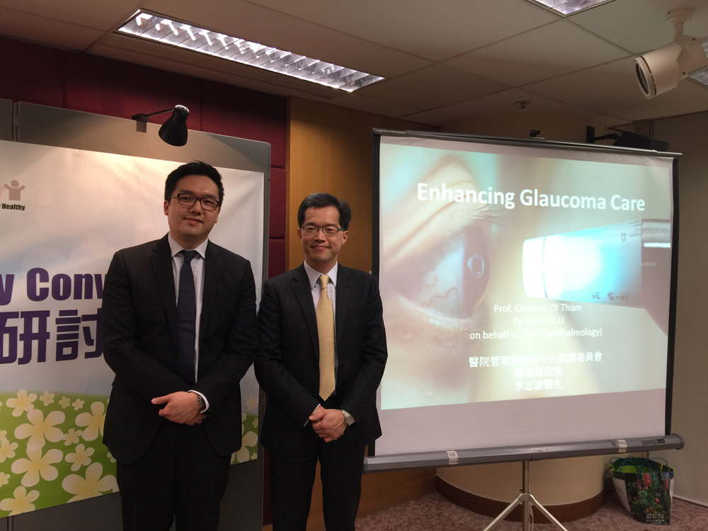 图:医管局眼科中央统筹委员会成员谭智勇(右)指,医管局将分三阶段推出计划,优化青光眼服务。左为医管局眼科中央统筹委员会成员李志康 本报记者张婕舒摄