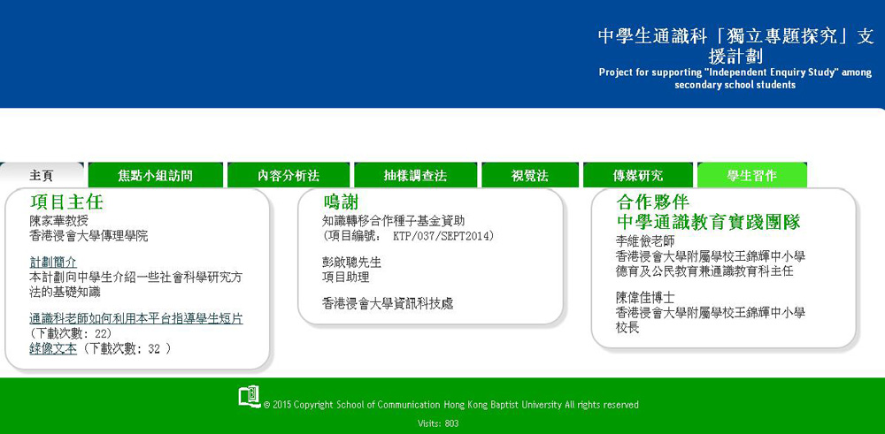 浸大传理学院教授陈家华表示,以往收到数十位学生电邮邀请做专访,希望学习社会科学研究方法的知识,并应用到专题探究之中,加上平日撰写社会科学研究及教学研究资料,就决定架设一个为中学通识科而设的专属网站。是项计划获浸大知识转移合作种子基金资助,架设网站及邀请助手,选出学生感兴趣的研究题目,由一篇5000字的英文论文翻译成约1500字的作品,较多文章都与广告研究分析有关,再辑录成只有三分钟的录像短片、录像简报和录像文本,研究报告和问卷范例上载至专属网站,以供学生参考。教师则可下载研究报告原文作教学之用。