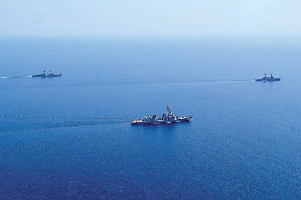 图:日本“春雨”号(中)和“天雾”号(左)驱逐舰与菲海军“艾卡拉兹”号12日在南海举行军演 法新社