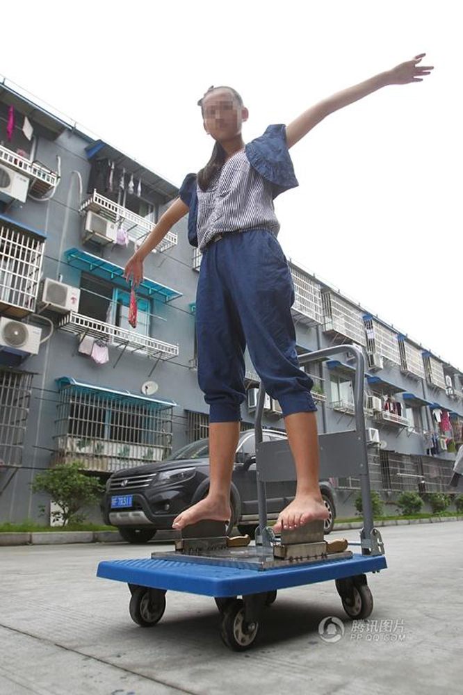 二十二日,浙江温州十三岁的永嘉女孩小谢在家门口表演赤脚踩刀刃。她的父亲谢继奎搬来道具,一个带有两道凹槽的不銹钢刀架,然后将两把菜刀刀刃朝上插入刀架。小谢赤脚轻盈地踏上两面刀刃……谢继奎拿来两瓶共五公斤重的瓶装水,让踩在刀刃上的女儿提?舞动,他甚至还让女儿踩?刀刃写毛笔字。