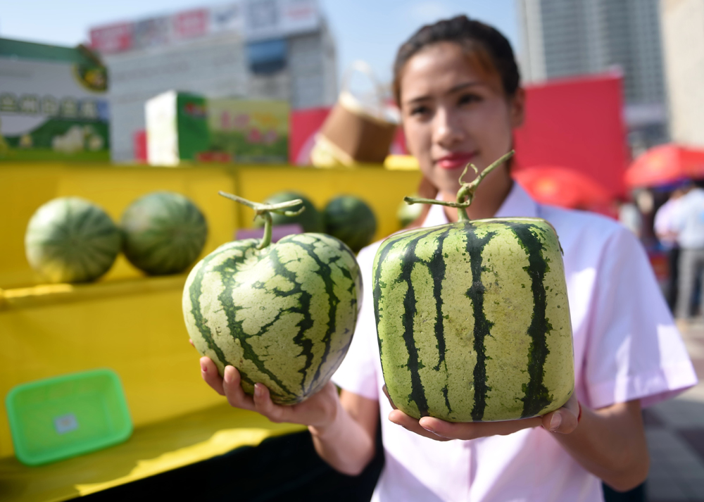 26日,甘肃省兰州举行农产品展销会,140多种特色农产品在展销会上亮相,一名工作人员展示造型奇特的方形和心形的西瓜。 新华社