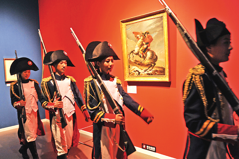 7月10日,“飞跃欧洲的雄鹰─拿破仑文物特展”在辽宁省博物馆拉开帷幕。本次展览共展出208件展品,是首次在中国举办的解读拿破仑生平的文物专题展。图为当日一队“法国士兵”从油画《跨越阿尔卑斯山圣伯纳隘道的拿破仑》前走过。