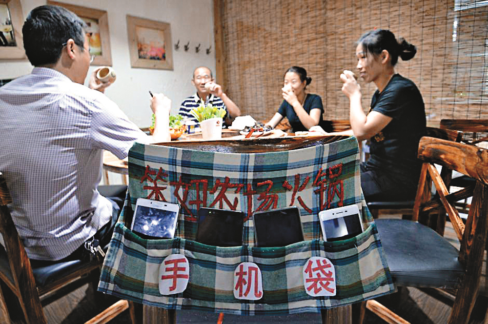 近日,河北省邯郸市一家火锅店製作了“手机 存放袋”,顾客用餐前先将手机放入“手机存放袋”内。该店负责人表示,就餐中很多顾客专注手机而忽略了周围的人,没有手机,顾客更享受与朋友家人在一起的快乐时光,于是就提供了“手机存放袋”。