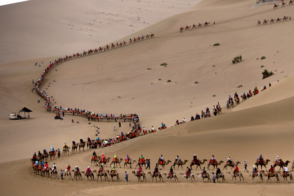 歷史文化名城─甘肃敦煌迎来旅游热潮。图为7月12日,游客骑骆驼在甘肃省敦煌市鸣沙山月牙泉景区游览。 新华社