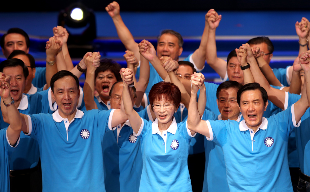 图:马英九(前右)、国民党主席朱立伦(前左)为洪秀柱造势/中央社