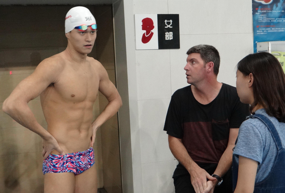 图:孙杨(左)19日与外籍教练布朗(中)在训练中交流/新华社