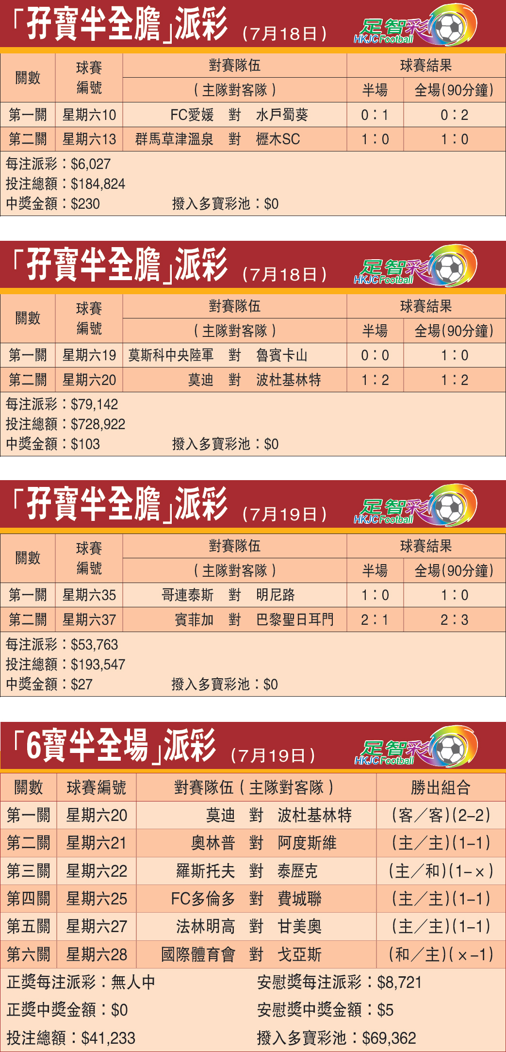 “孖宝半全胆”派彩 (7月18日)