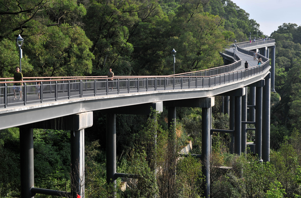 19日,民众在福州金鸡山公园览城栈道上游玩。栈道全长2680米,净宽4米,是目前福州市区最长的高空览城观景栈道,满足漫步与跑步的人群同时进行,同时可承载维护车辆通行。