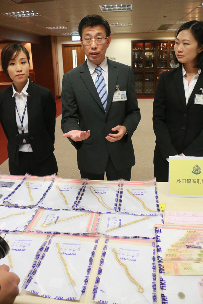 黄志明称,本月接获沙田一间当舖举报,指有年轻人用非足金的金链典当,该金链“断当期”到达,职员往查货时始发现金链是假货,于是报警。探员经深入调查后,展开拘捕行动,先后在沙田、屯门、深水?及葵涌拘捕六男一女。探员相信自去年底开始,这个假金链党在港九新界至少六间当舖及珠宝店犯案。而行动中检获的15条金链,初步检验后相信全部均非足金,金链表层包上真金,内里则为其他金属,警方稍后将交予政府化验师作进一步化验。