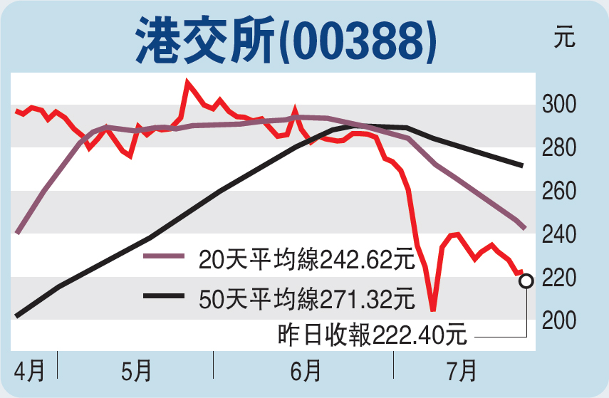 美银美林下调港交所(00388)今年每股盈利20%,并大削目标价34%至220元,评级亦降至“逊于大市”,主因港交所盈利仍十分倚重股市成交量,60%港交所收入均来自与大市成量交密切相关的业务,包括现货股票市场、结算及衍生工具。