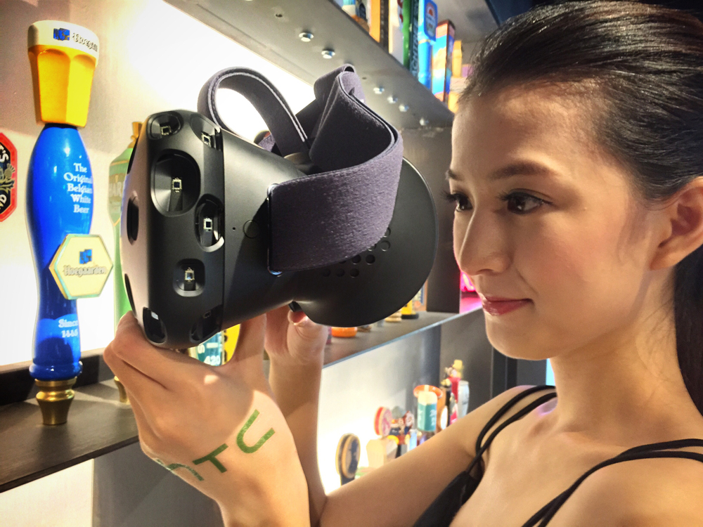宏达电子公司23日在台北展示今年3月在MWC(全球行动通讯大会)上发表的HTC Vive虚拟实境头戴设备,预计今年10月公布上市