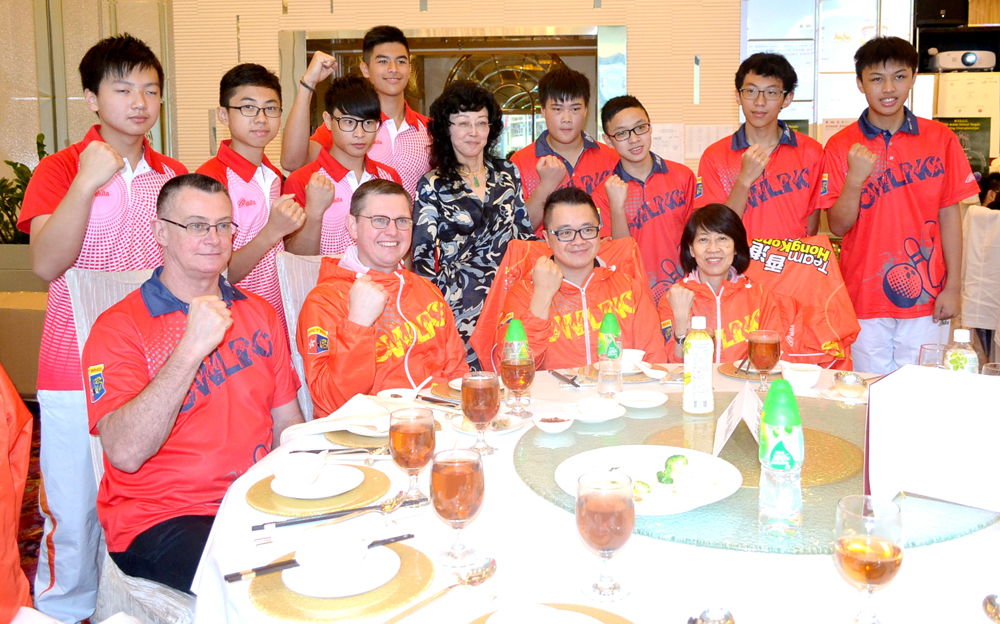 图:刘掌珠(第二排左四)在记者会后与港队主帅比尔荷夫曼(前排左二)及球员贝荻(后排左)等合照