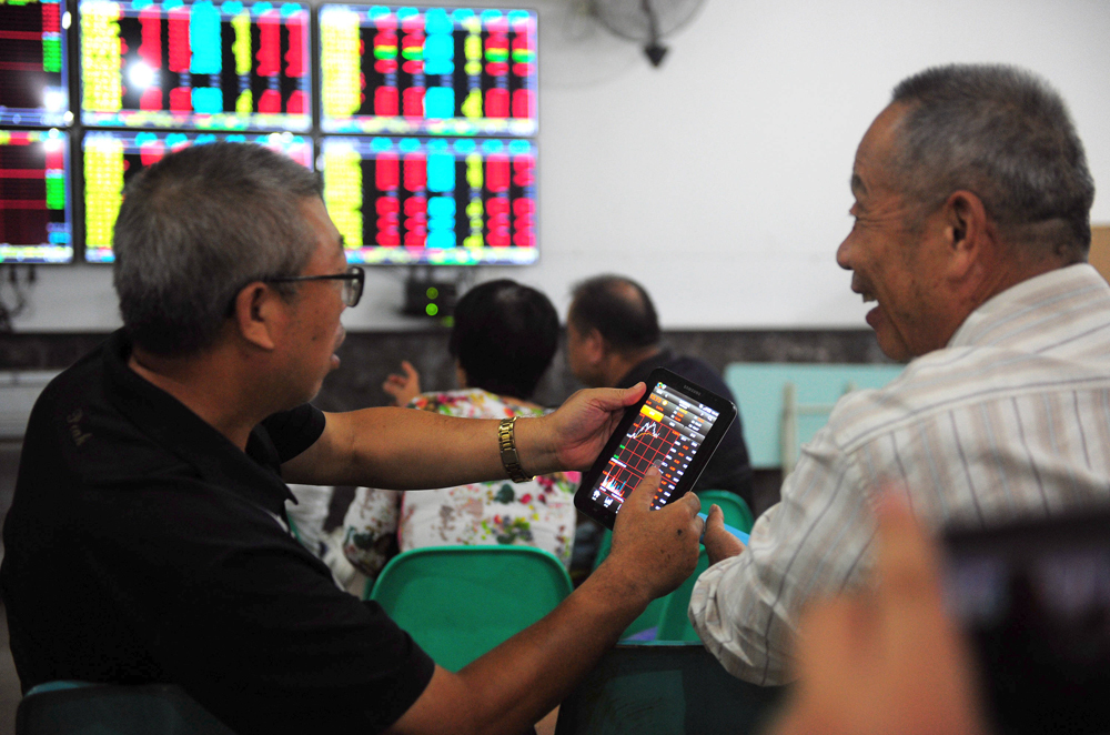 图:武汉一证券交易厅内股民手持平板电脑看股价 中新社