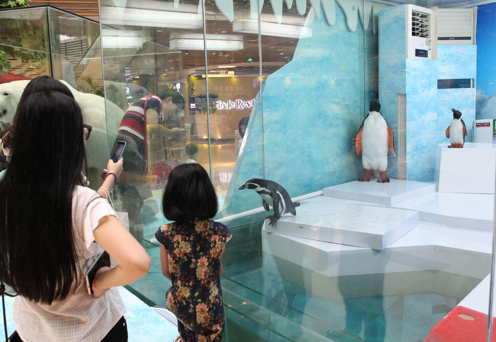 7月23日,重庆江北一商场“请”来企鹅帮忙站台,吸引众多市民围观。由于重庆天气炎热,工作人员不仅为企鹅的房间配备了空调和消毒机,还为企鹅的住所准备了可以随时下水游泳的水池。 中新社