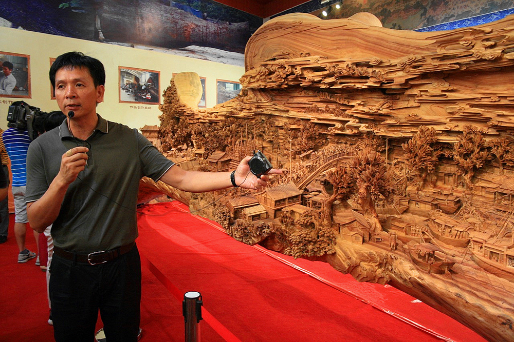 图:郑春辉歷时四年时间创作完成的巨型木雕作品《清明上河图》,于2013年被载入健力士世界纪录 大公报记者郑云风摄