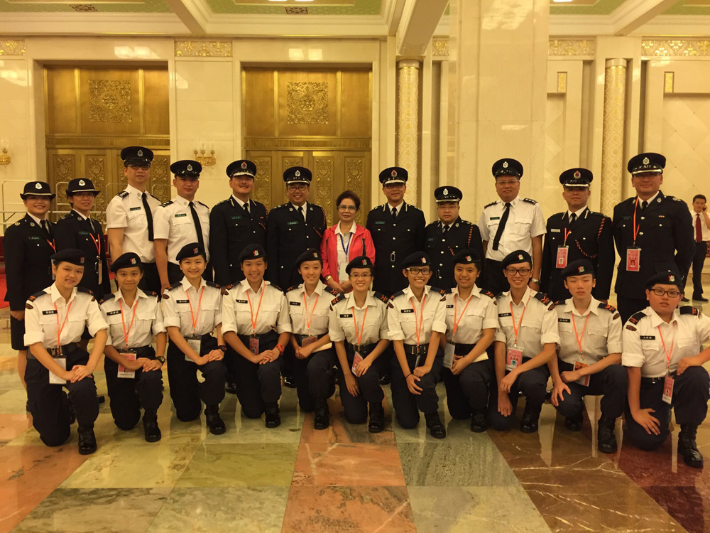 图:交流团团长李鋈麟(后排左六)及副团长李鋈发(后排右四)同本港青少年制服团体成员出席北京人民大会堂活动时合影