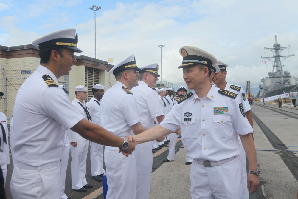 图:12日,中国海军郑和舰抵达美国夏威夷珍珠港,郑和舰指挥员严正明(右一)与前来迎接的美国海军官兵代表握手\中新社