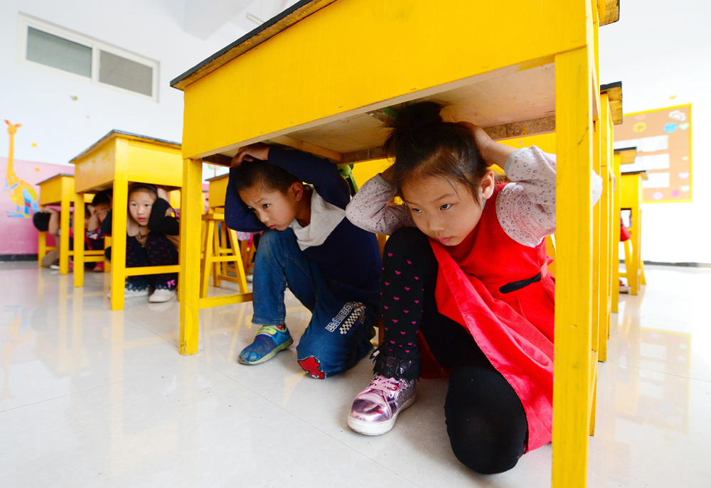 减灾日,河北邢台桥东区立德小学开展校园安全教育,组织学生进行灾害应急演练,增强学生的安全自救能力。 新华社