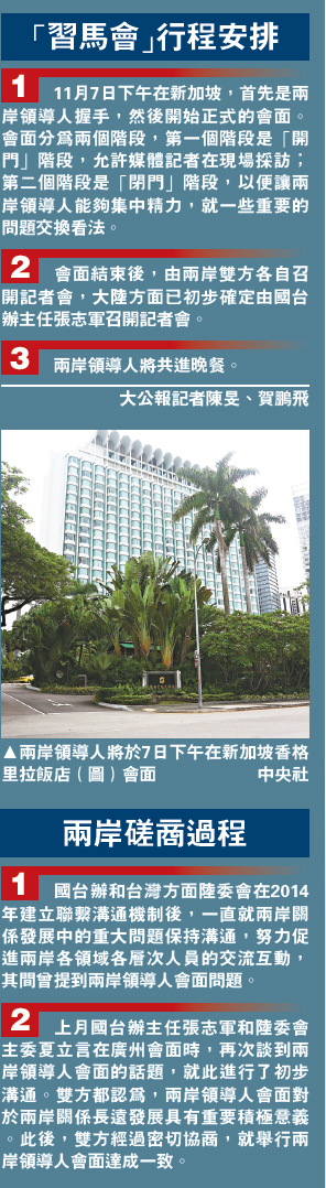 【大公报讯】据新华社北京报道:张志军专门就此次重要会面接受记者採访,介绍相关情况。他表示,即将举行的两岸领导人会面将开启两岸领导人直接交流沟通的先河,有利于两岸双方增进互信,巩固共同政治基础,推进两岸关系和平发展,维护台海和平稳定,是两岸关系发展史上具有里程碑意义的大事。
