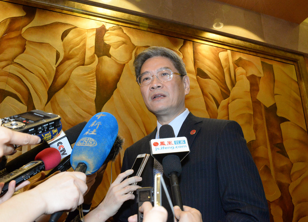 图:国台办主任张志军4日在南京紫金山峰会上介绍“习马会”相关情况\大公报记者贺鹏飞摄