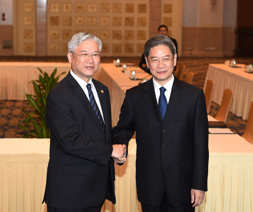 图:十月十四日,国台办主任张志军(右)与台湾方面陆委会主委夏立言在广州会面”资料图片