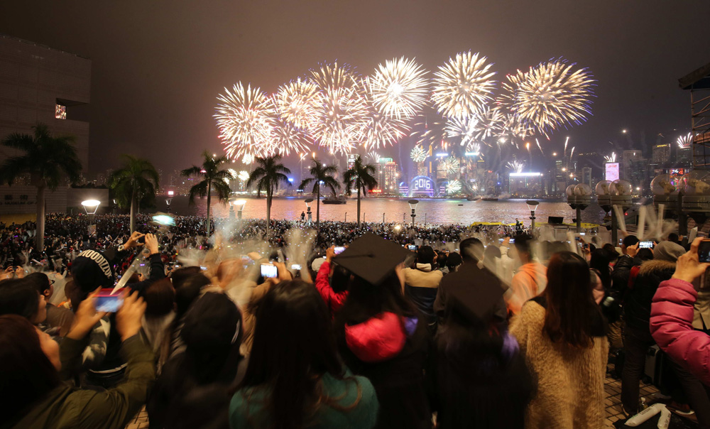 火树银花耀香江,欢声笑语迎新年!除夕夜,逾30万人欢聚维港两岸,送旧迎新,在震天的倒数声中,在璀璨的“流星”下,香港告别纷争跌宕的旧岁,走向机遇与挑战并存的2016年。展望新一年,市民纷纷许下新期愿:创新发展振经济,香港和谐利民生! 大公报记者 曾敏捷 何进昇