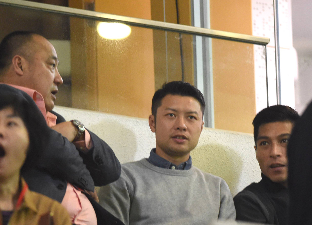 图:杨正光(中)与梅州五华总经理曹阳、已加盟五华的港脚李志豪(右)观战 大公报记者李恆基摄