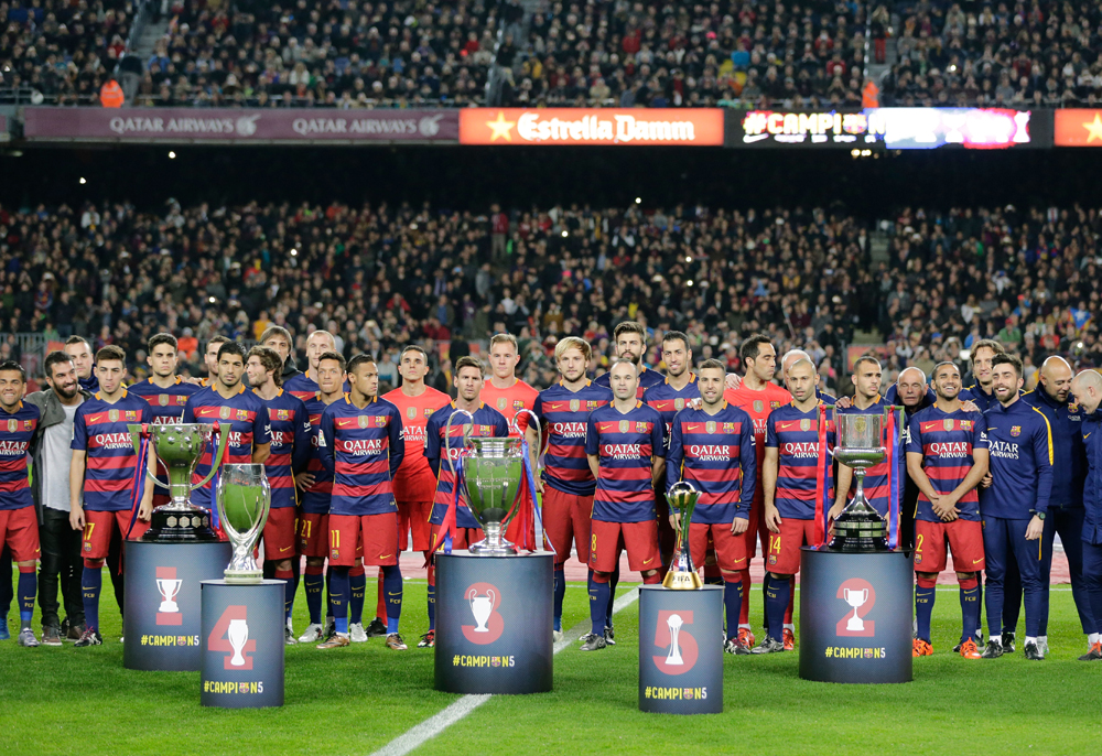 图:巴塞于赛前展示五座于2015年赢得的奖杯 美联社