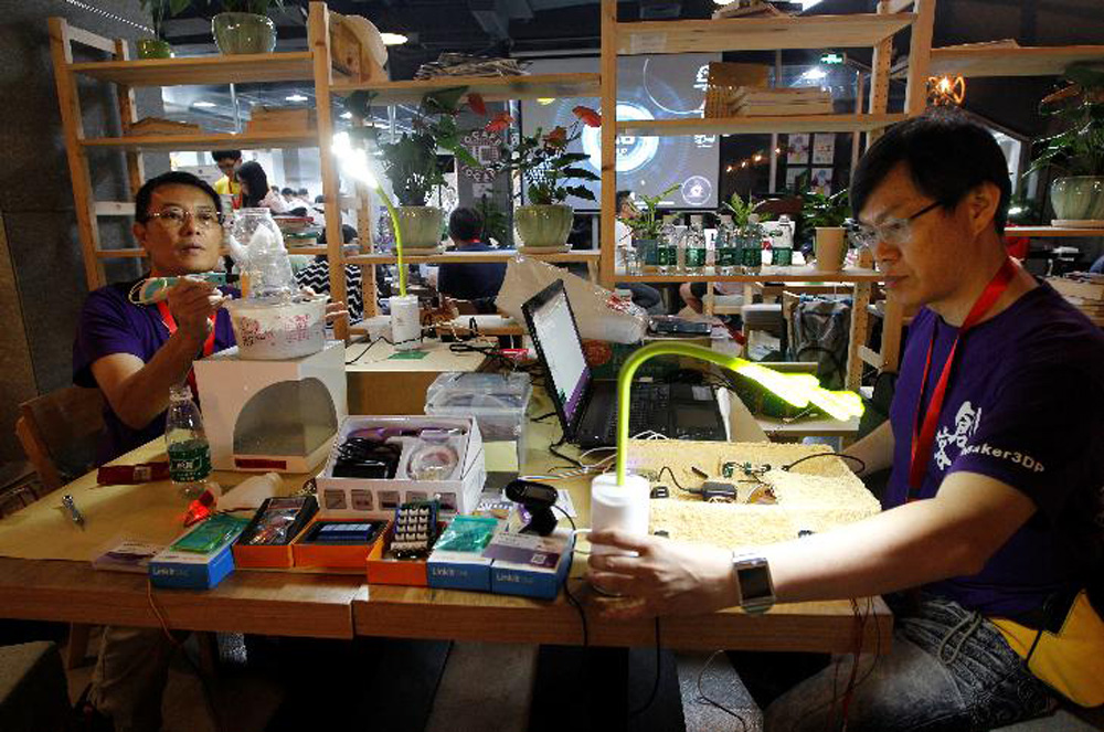 图:2015年10月的“双创周”上,深圳创客们在製作作品 资料图片