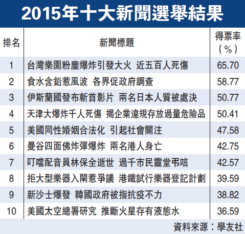 选举于去年九至十二月进行,近七万中学生参与投票。十大新闻中,国际及两岸新闻有七则,四则排名前五的分别是台湾乐园粉尘爆炸、伊斯兰国发布斩杀日本人质影片、天津大爆炸、美国同性婚姻合法化(见附表)。