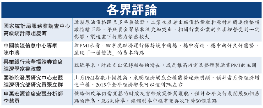申万宏源首席宏观分析师李慧勇坦言,上月PMI虽然环比微升,但仍略逊预期,且已连续第五个月低于荣枯线,去年製造业PMI的颓势收官,预示今年製造业压力依然未减。他续称,大型企业仍处扩张区间,并成为稳增长的主力军,相比之下小型企业在产业结构调整中依然面临较大困难。