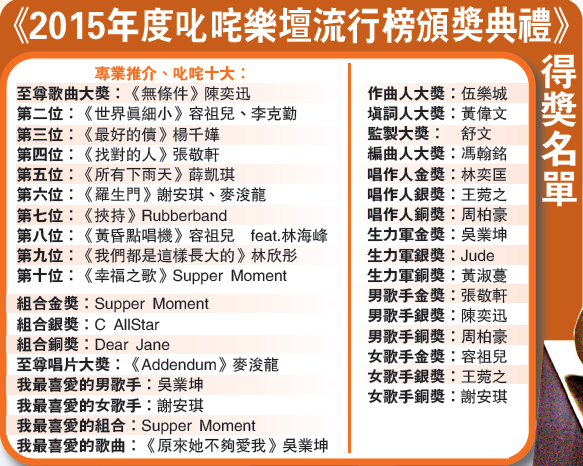 【大公报讯】记者吴珊珊、温颖芝报道:乐坛第三张成绩表《2015年度叱?乐坛流行榜颁奖典礼》昨晚在湾仔会展举行,全晚共颁发四十三个奖项,由乐迷投选的“我最喜爱的男女歌手”分别由吴业坤(坤哥)及谢安琪(Kay)夺得,而“我最喜爱的歌曲”大奖同样由坤哥的《原来她不够爱我》夺得,连同生力军金奖,他共夺三奖。至于“我最喜爱的组合”就由Supper Moment夺得,他们还以《幸福之歌》夺“叱?十大”第十位及组合金奖,与坤哥齐齐以三奖成为大赢家。而谢安琪及容祖儿就各夺2.5个奖。祖儿已是第十届夺女歌手金奖,她致谢时直言创业难,守业更难,多年来她一直守守守,这个奖不易得到,因不是要求每个人喜欢就可以,但希望用努力让大家觉得每年给她一次掌声是值得的。