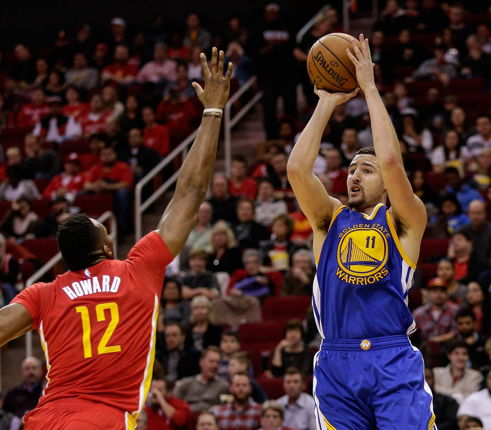 图:勇士射手基利汤逊(右)在迪韦特侯活拦阻前出手投篮\法新社