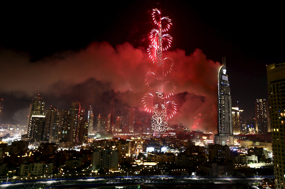 图:哈利法塔举行新年烟花汇演,毗邻的阿德里斯酒店浓烟滚滚\路透社