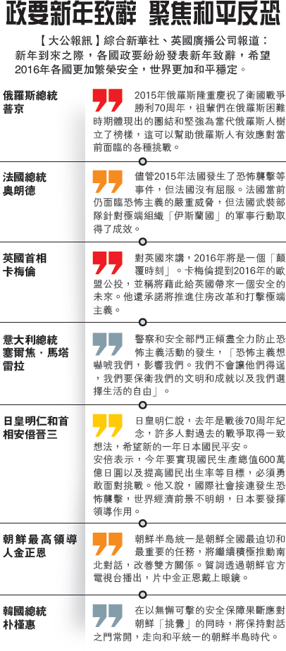 讯】综合新华社、英国广播公司报道:新年到来之际,各国政要纷纷发表新年致辞,希望2016年各国更加繁荣安全,世界更加和平稳定。