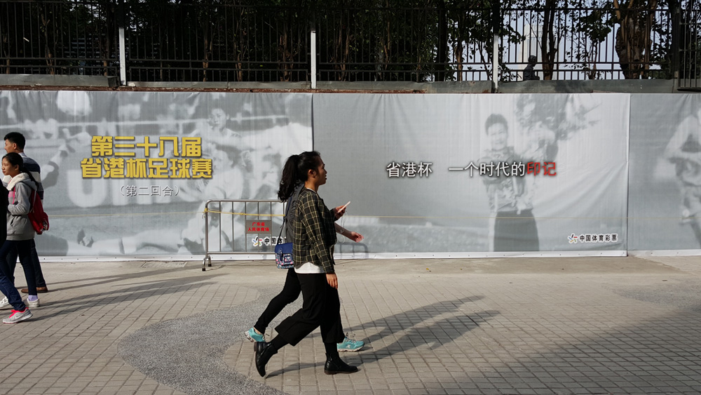 图:东校场外已有省港杯的宣传,以“一个时代的印记”为主题宣传赛事 /大公报记者李恆基摄