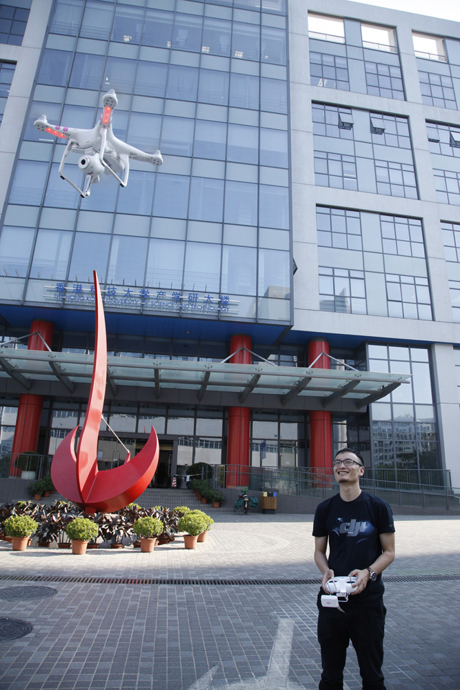 图:汪滔在公司楼前演示操控无人机/受访者供图
